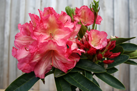 Contact us for the price of this grade. Early mid season. ('Pink Petticoats' x 'Ring of Fire') Full trusses of warm salmon pink flowers with reddish edges and creamy yellow centres. A strong plant with an excellent growth habit.