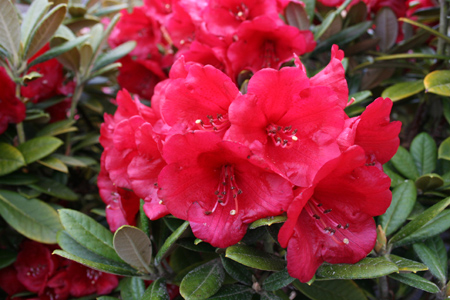 Mid season. .5m (yakushimanum x sanguineum var. haemaleum) Suitable for container. This variety tolerates both colder and warmer climates. Silver indumentum is a feature of the lovely foliage and the small compact, currant red flowers, are a bonus. Very compact habit.