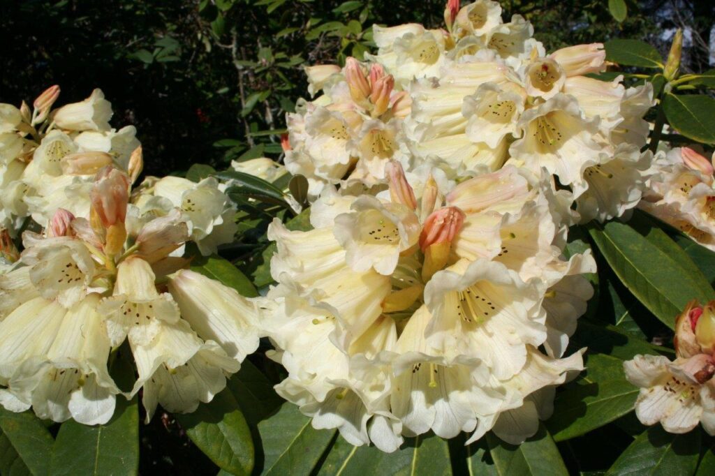 Early. 2m (macabeanum x unknown) The large upright trusses are apricot pink, fading to cream. Large leaved plant.