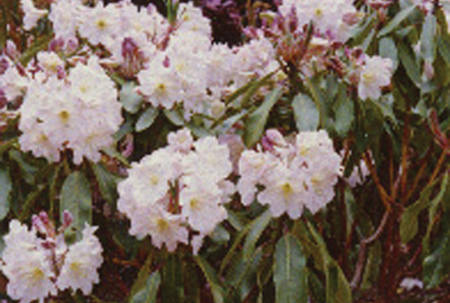 Mid season. 1.8m (fortunei x campylocarpum Hybrid) Smokey in bud, opens buff with very smokey markings and a green eye. A most unusual and delicate colour combination. Attractive foliage is an added bonus. Sweetly fragrant.