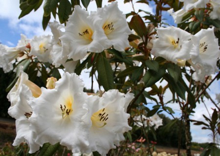 Mid season. 1.5m (lindleyi x nuttallii) Raised at Cross Hills. This variety tolerates both colder and warmer climates. This upright growing rhododendron has deeply veined, dark green foliage. The lily-like white flowers have a large gold blaze in the throat. Their perfume is an added bonus. Does need protection from frosts.