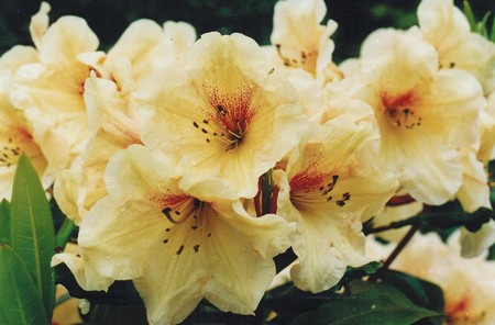 Early mid season. 1.5m (Unknown) The round trusses of butter yellow have a striking maroon- red flare in the throat. Good dark green foliage.