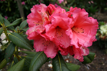 Late mid season. 1.5m ('Margaret Dunn' x ['Anna' x 'King of Shrubs']) Perfect truss of orange red, but nearer to orange than red. Light green foliage and bronze new growth.