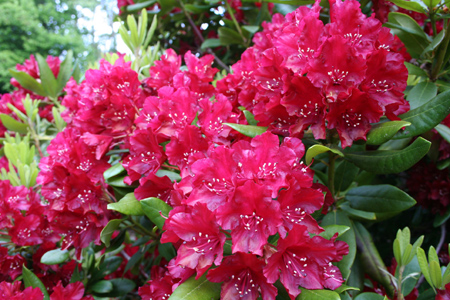 Mid season. 1.5m ('Mars' x 'Nova Zembla') Dark velvet, blood red flowers with prominent peach stamens. Upright growth habit, the foliage having an unusual twist to it.