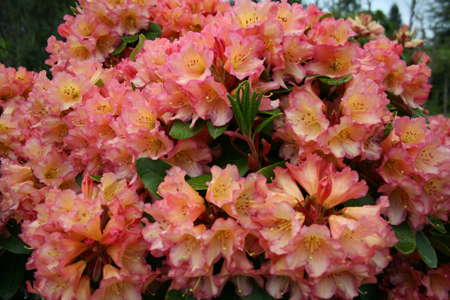 Mid season. 1m ('Orange Marmalade' x 'Unique') Bright red buds open to rosy pink flowers with an orange throat. Wavy edged with delicate spotting. Low growing, compact plant, glossy, dark green leaves.